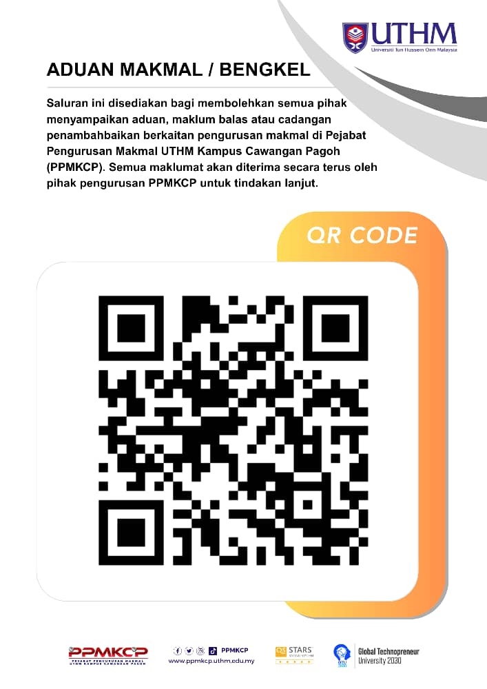 Saluran ini disediakan bagi membolehkan semua pihak menyampaikan aduan, maklum balas atau cadangan penambahbaikan berkaitan pengurusan makmal di Pejabat Pengurusan Makmal UTHM Kampus Cawangan Pagoh (PPMKCP). Semua maklumat akan diterima secara terus oleh pihak pengurusan PPMKCP untuk tindakan lanjut.